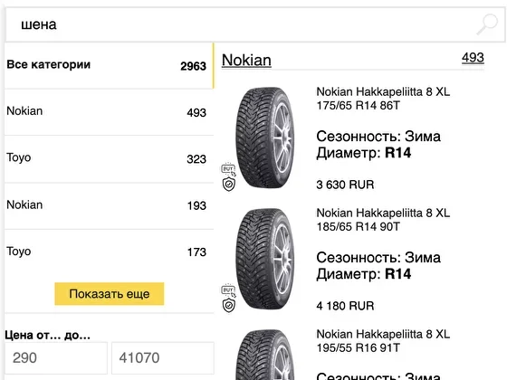 Ao inserir uma consulta de pesquisa, o SearchBooster gera e exibe automaticamente filtros na tela do usuário, com os quais o usuário pode filtrar produtos de acordo com as propriedades que precisa.