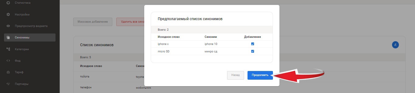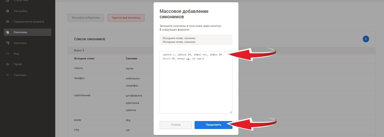 Для наиболее точного поиска релевантных товаров важно указать все возможные синонимы для ваших товаров. Чем больше синонимов вы укажете, тем больше пользователей получит ответ на свой запрос.