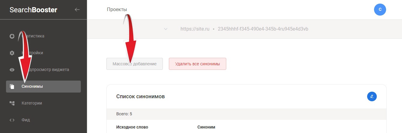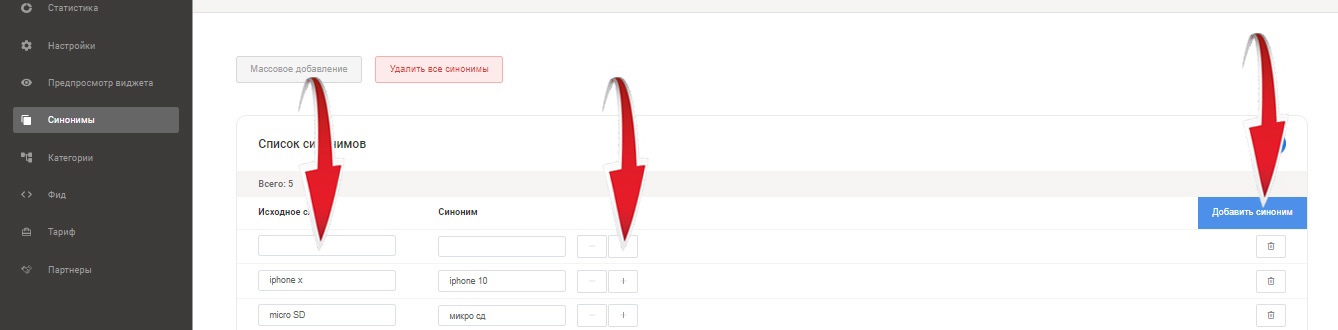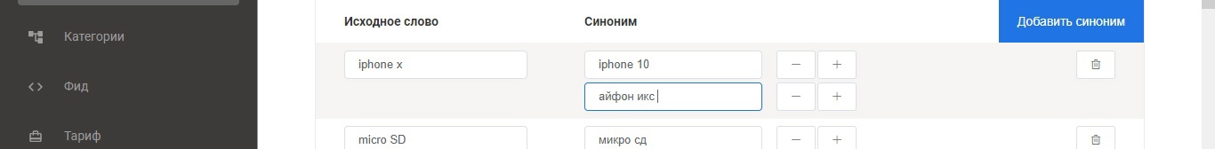 Нажмите «Добавить синонимы». Сверху появится новая строка. Прямо в нее необходимо вписать слова. Сохранение происходит автоматически. Если синонимов более одного, то просто нажмите плюсик и в строке появится новое поле.