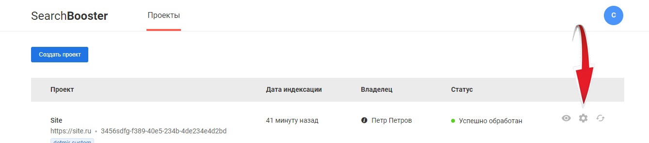 После авторизации выберите нужный проект и нажмите на шестеренку.