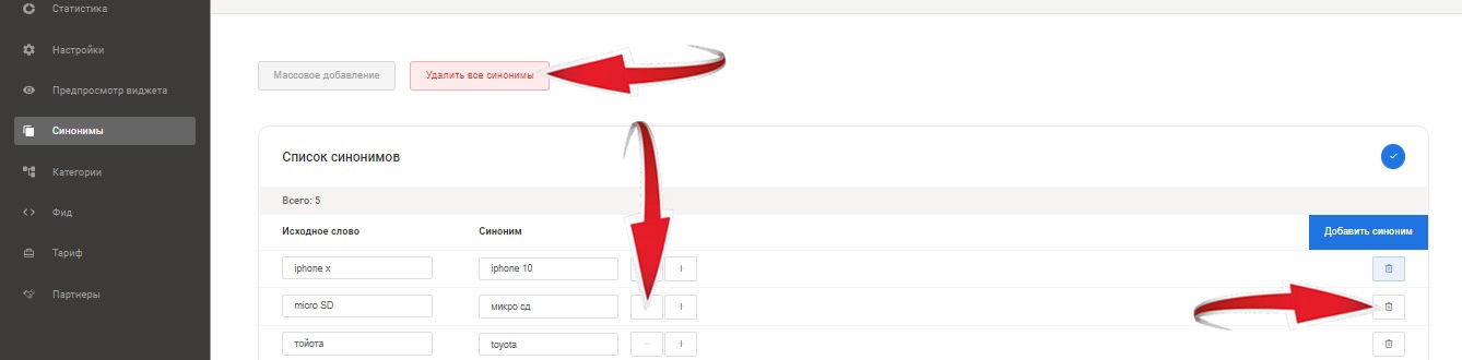 Удалить можно все синонимы сразу, нажав «Удалить все синонимы». Можно удалить одну строку, нажав на корзину или отдельное слово в строке, нажав минус.