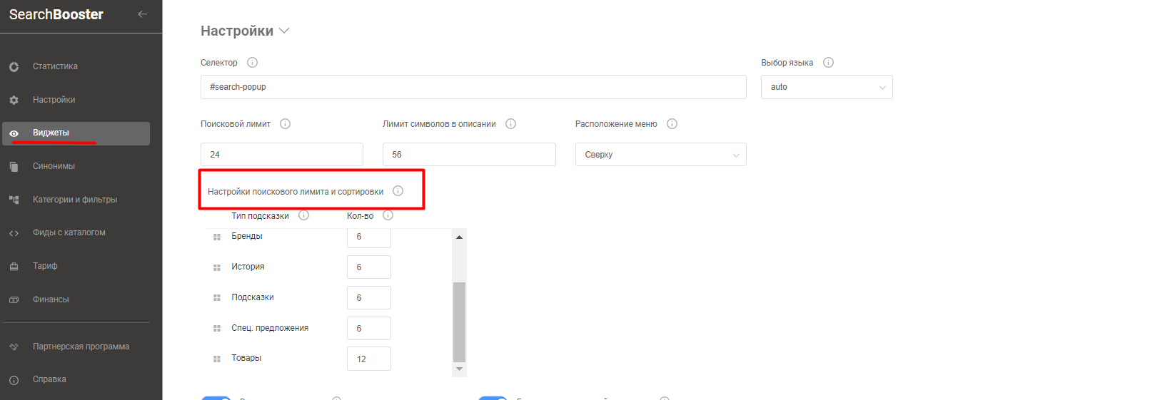 предлагает пользователям возможности для настройки типов поискового лимита и сортировки категорий, предложений и товаров в выдаче поискового виджета. Эта опция позволяет максимально расширить ассортимент товаров (услуг), отображаемых в подсказках и основной выдаче.