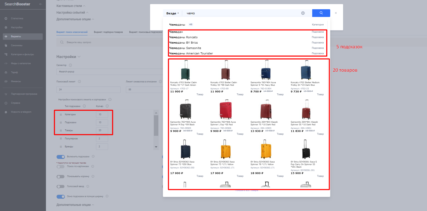 Пользователь может кастомно определять включение в подсказки определенных их типов (“Популярное”, “Категории”, “Бренды”, “История”, “Подсказки”, “Спец. предложения”, “Товары”), порядок расположения в виджете при вводе запроса, а также задавать лимит количества каждого типа подсказок.