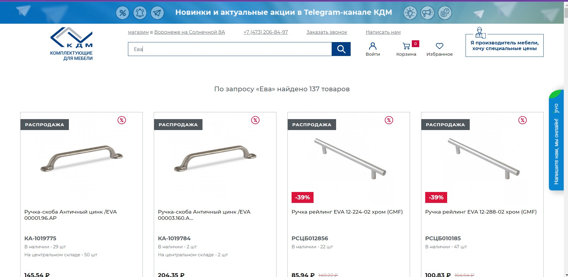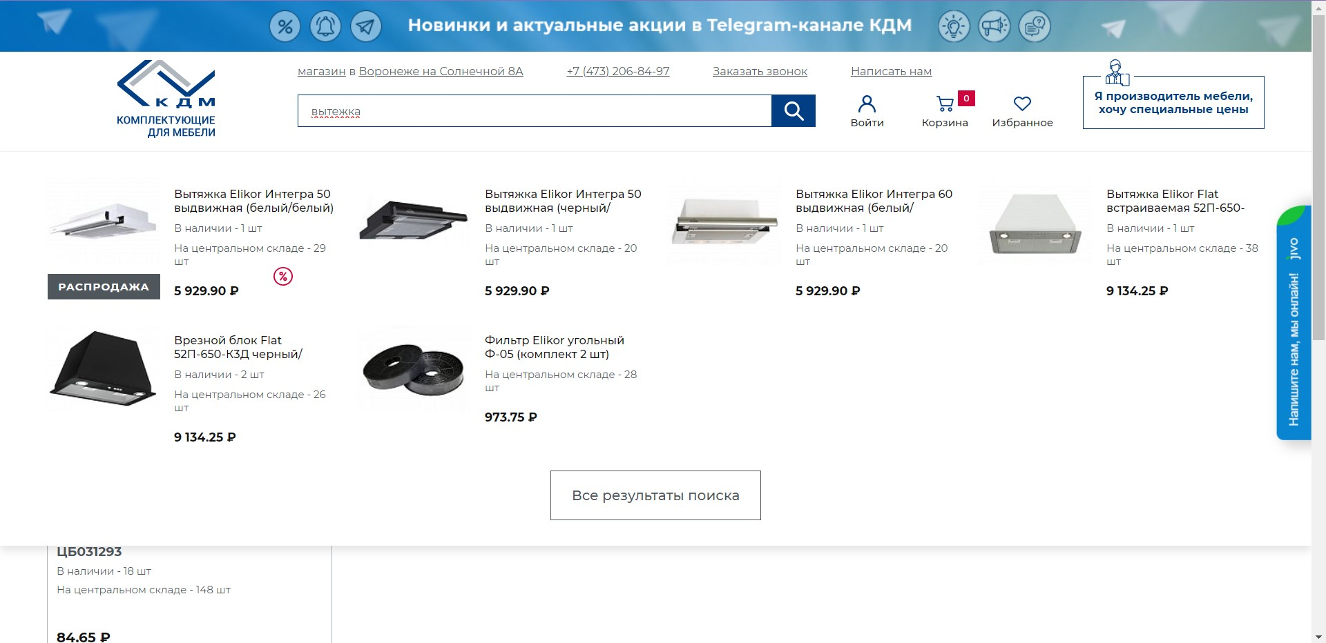 Интернет-магазин kdm.ru с широким ассортиментом комплектующих для мебели от различных производителей столкнулся с проблемой эффективного внутреннего поиска по сайту своего интернет-магазина. Специфика магазина включала работу с запросами, содержащими названия производителей на русском языке, транслитерацию, опечатки и поиск по артикулам, что стандартный поиск из CMS не мог удовлетворить.